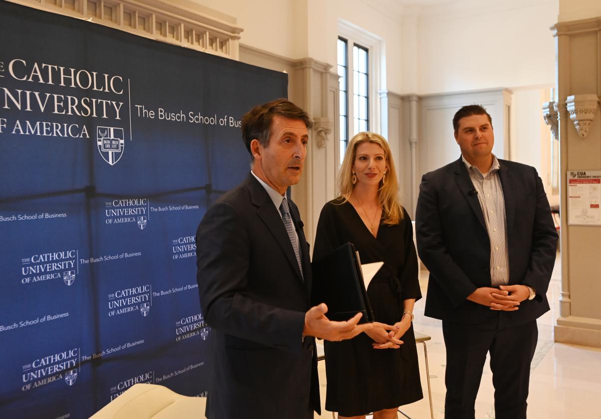 The lab and match were announced at the school’s reception during Cardinal Weekend, Catholic University’s annual homecoming and reunion event. Busch School alumni and friends gathered in Maloney Hall to reconnect with professors, catch up with classmates, and peruse the showcase featuring alumni-owned businesses.